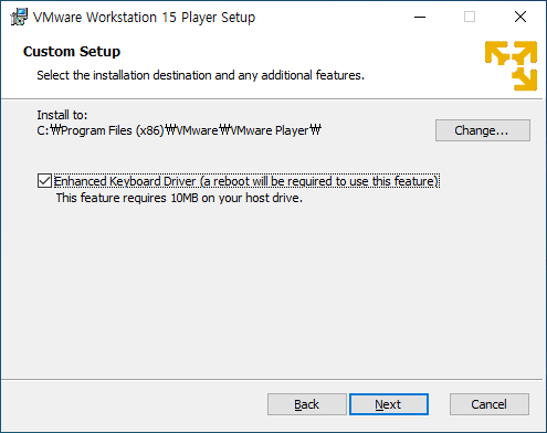 프로그램 설치하면 재시작해야 한다고 뜨는데, 프로그램 종료 및 백업 후에 재시작하고, VMWare Player 프로그램을 다시 실행하면,