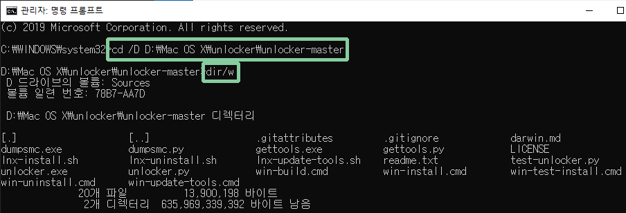D:\Mac OS X\unlocker\unlocker-master는 윈도우 폴더의 경로를 뜻합니다.
