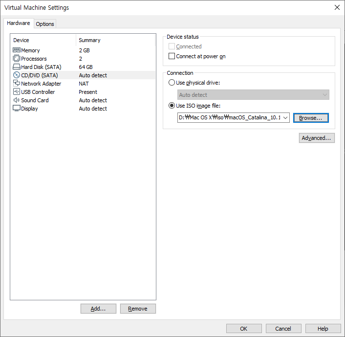 너는 수동으로 darwin.iso를 mount를 시켜라. 이 예제는 Workstation 11 이나 Player 7로 하고 있다.
