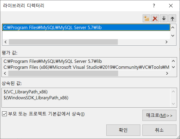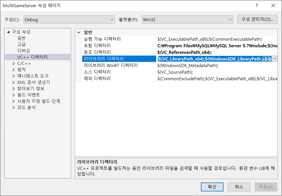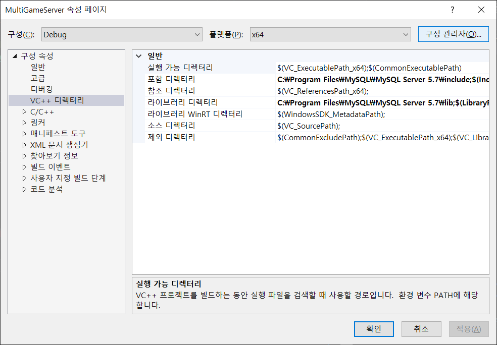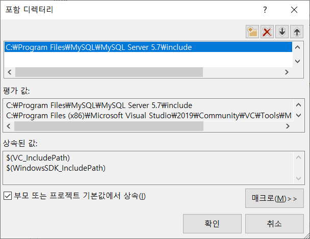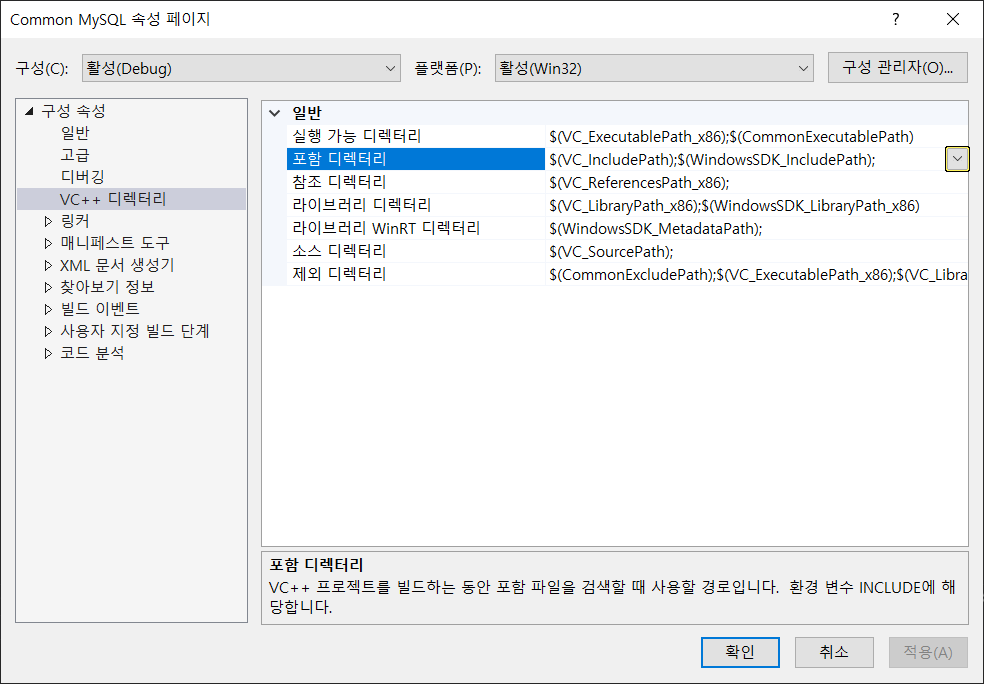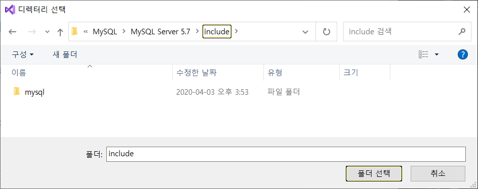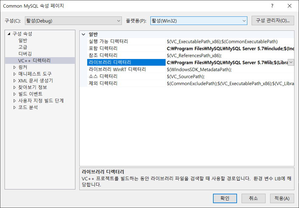 추가 포함 디렉토리 경로 : C:\Program Files\MySQL\MySQL Server 5.7\include