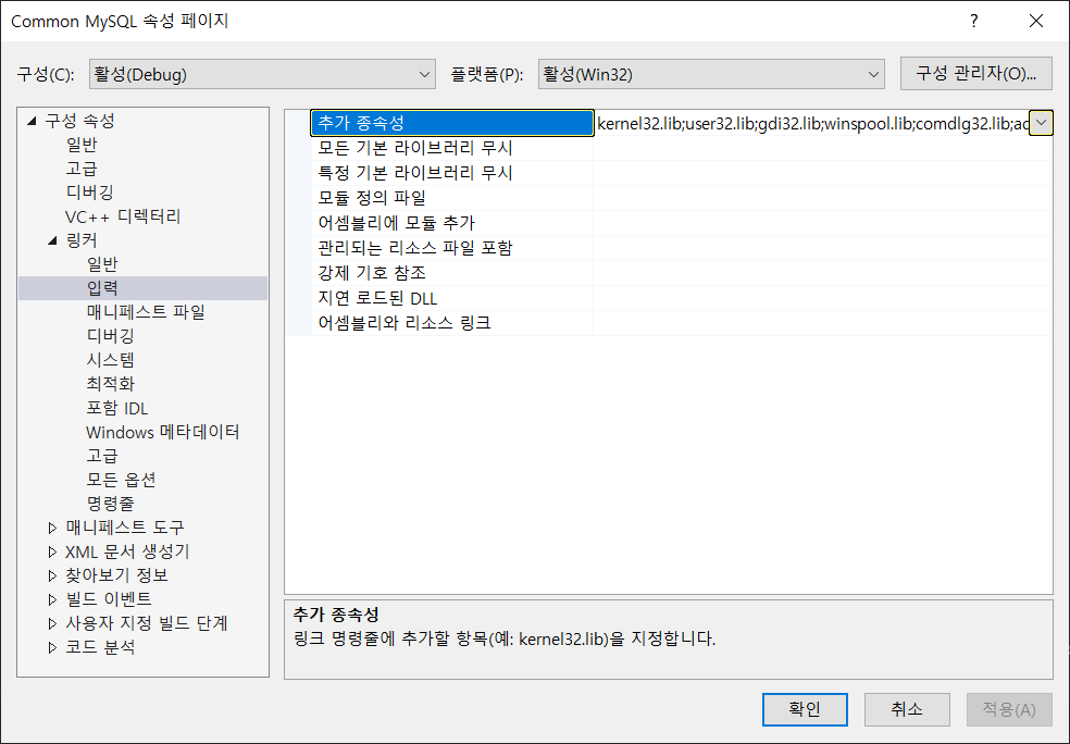 구성속성 -> 링커 -> 입력 -> 추가 종속성을 눌러줍니다.