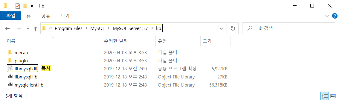 C:\Program Files\MySQL\MySQL Server 5.7\lib\libmysql.dll에서복사해서