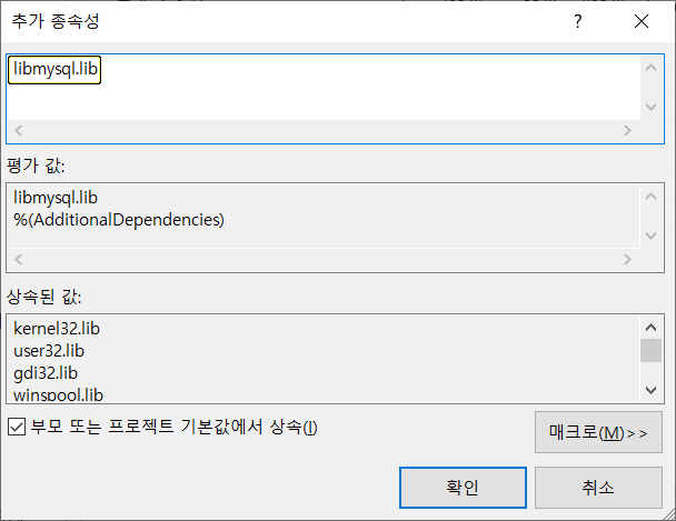 아이콘을 눌러서, libmysql.lib를 적어줍니다.