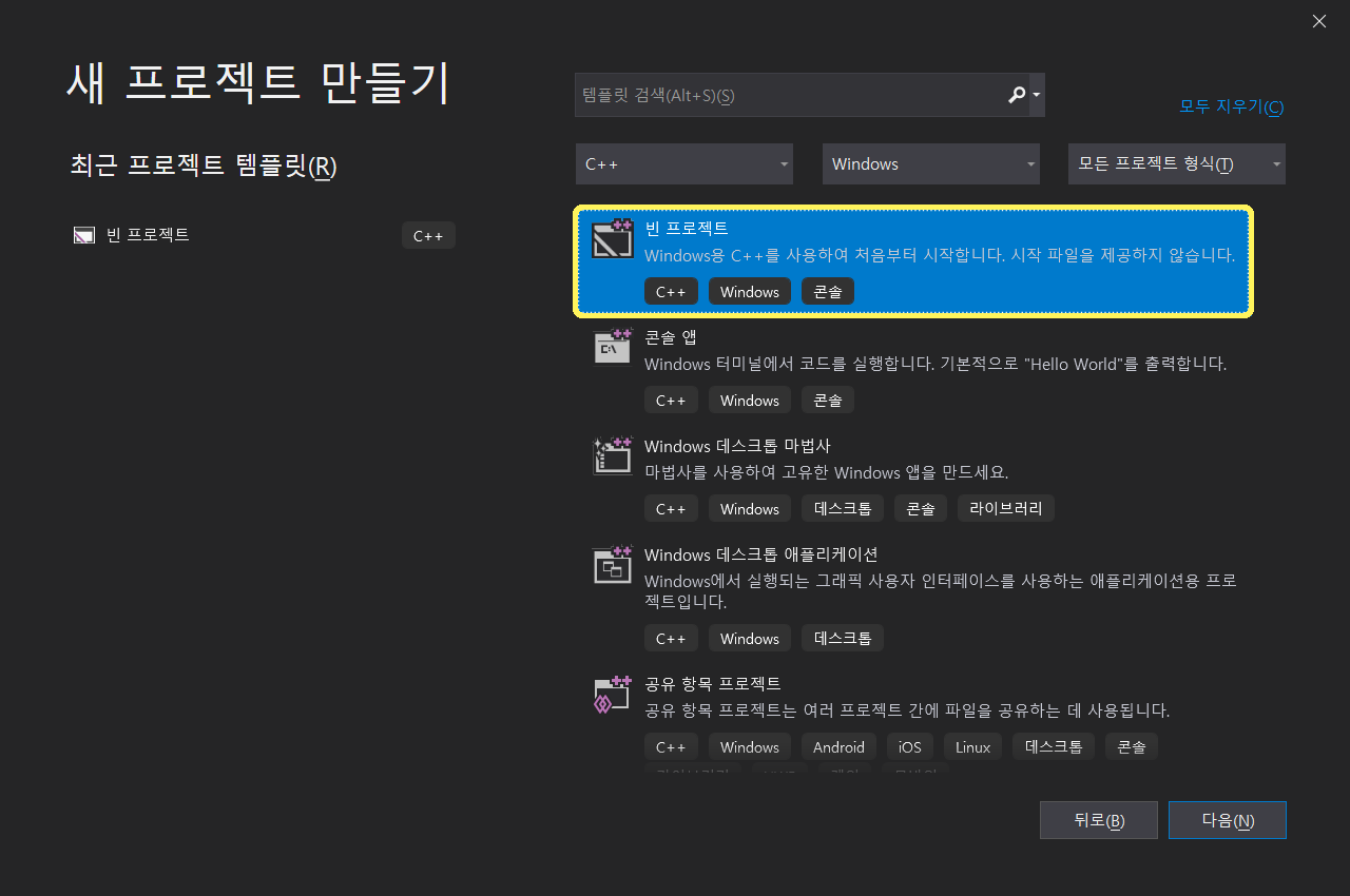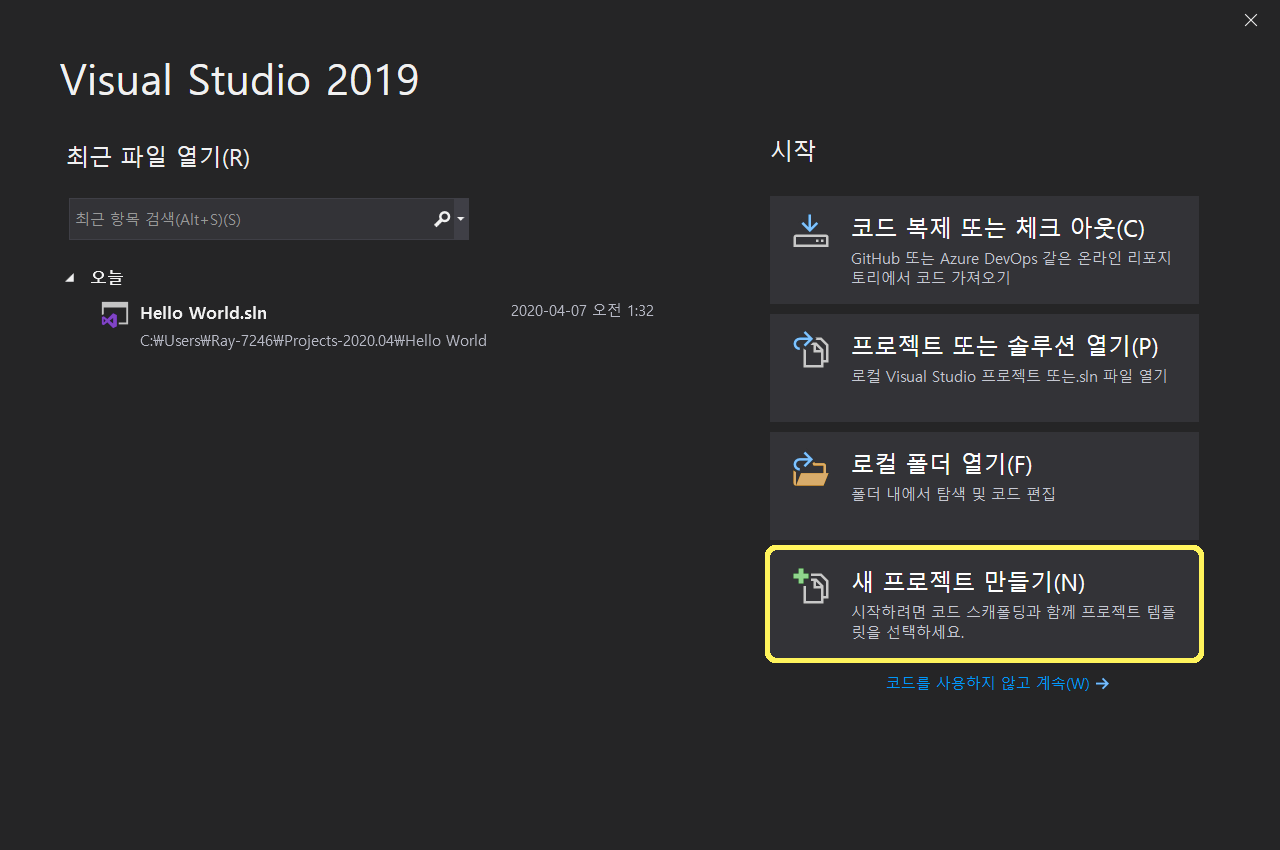 Visual Studio 2019 를 관리자권한으로 실행을 누르시고, 새 프로젝트 만들기를 해줍니다.