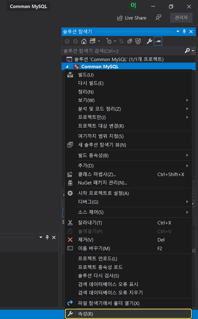 프로젝트를 선택하고 프로젝트 속성을 클릭해줍니다.