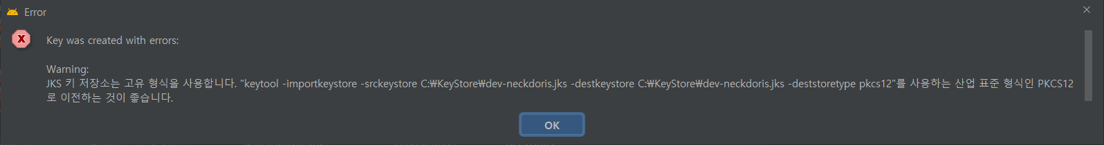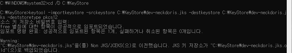 JKS 키 저장소는 고유 형식을 사용합니다. "keytool -importkeystore -srckeystore C:\KeyStore\dev-neckdoris.jks -destkeystore C:\KeyStore\dev-neckdoris.jks -deststoretype pkcs12"를 사용하는 산업 표준 형식인 PKCS12로 이전하는 것이 좋습니다.
